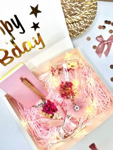 Die Box ist mit Details wie einem Schlüsselanhänger mit Blumendetails, einem Notizbuch, einem Stift, einem Ministrauß aus Trockenblumen und einer LED-Lichterkette verziert.