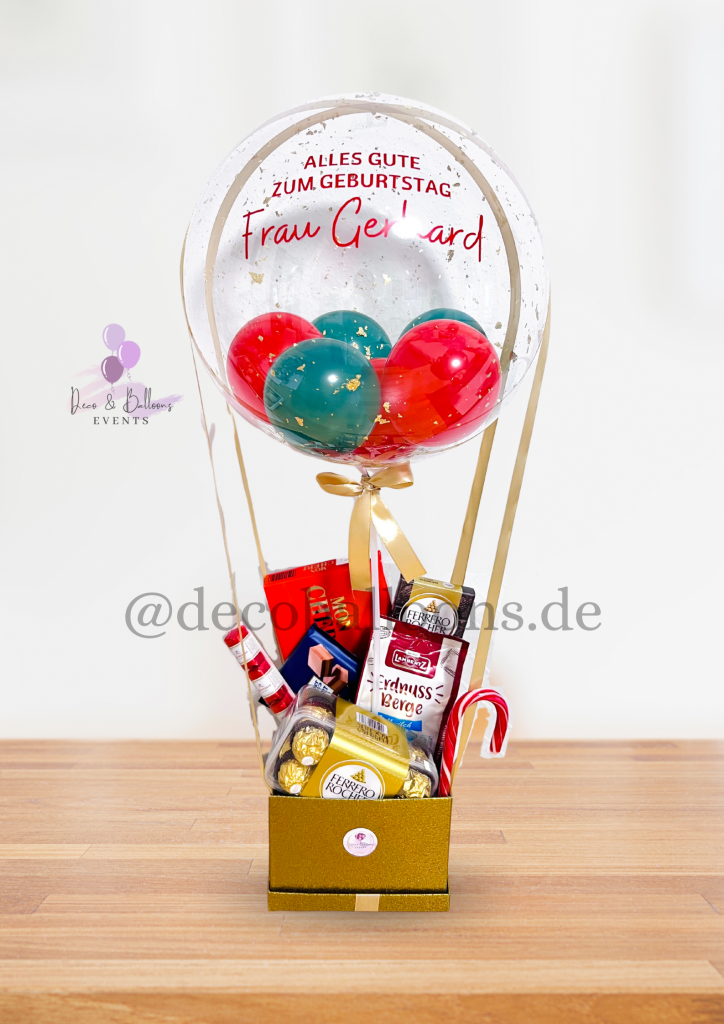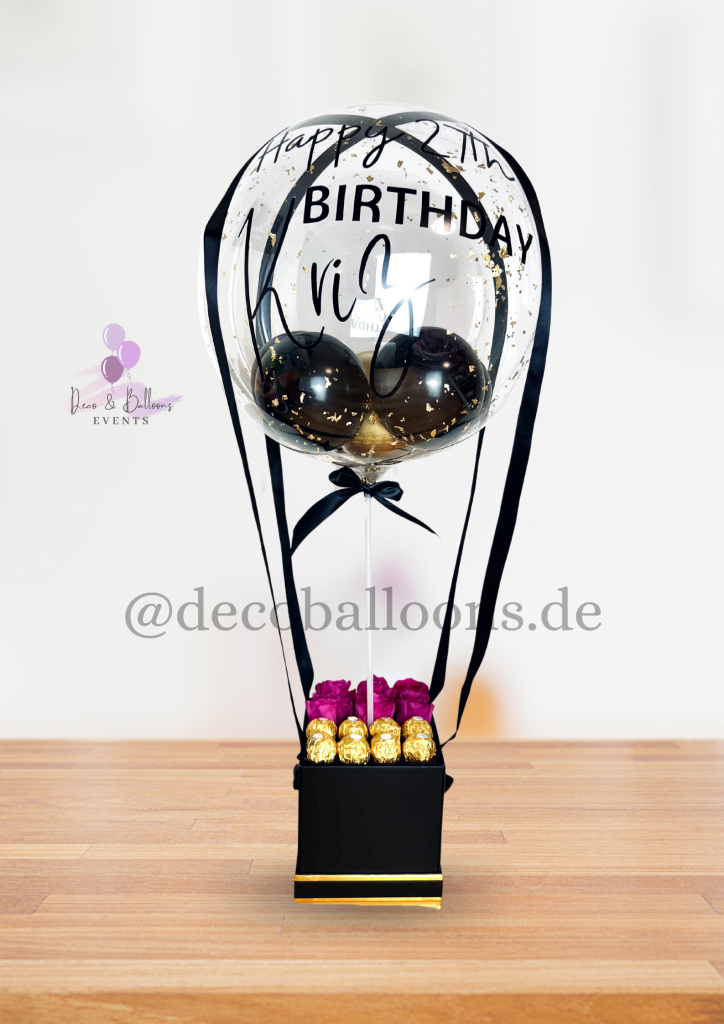 „Hallo Decoballoons, ich möchte einen deiner Hot Air Ballons zum 30. Geburtstag meiner Schwester bestellen. Ihre Lieblingsfarben sind Fuchsia, Weiß und Gold. Kannst du bitte eine abwechslungsreiche Auswahl an dunkler Schokolade hinzufügen?