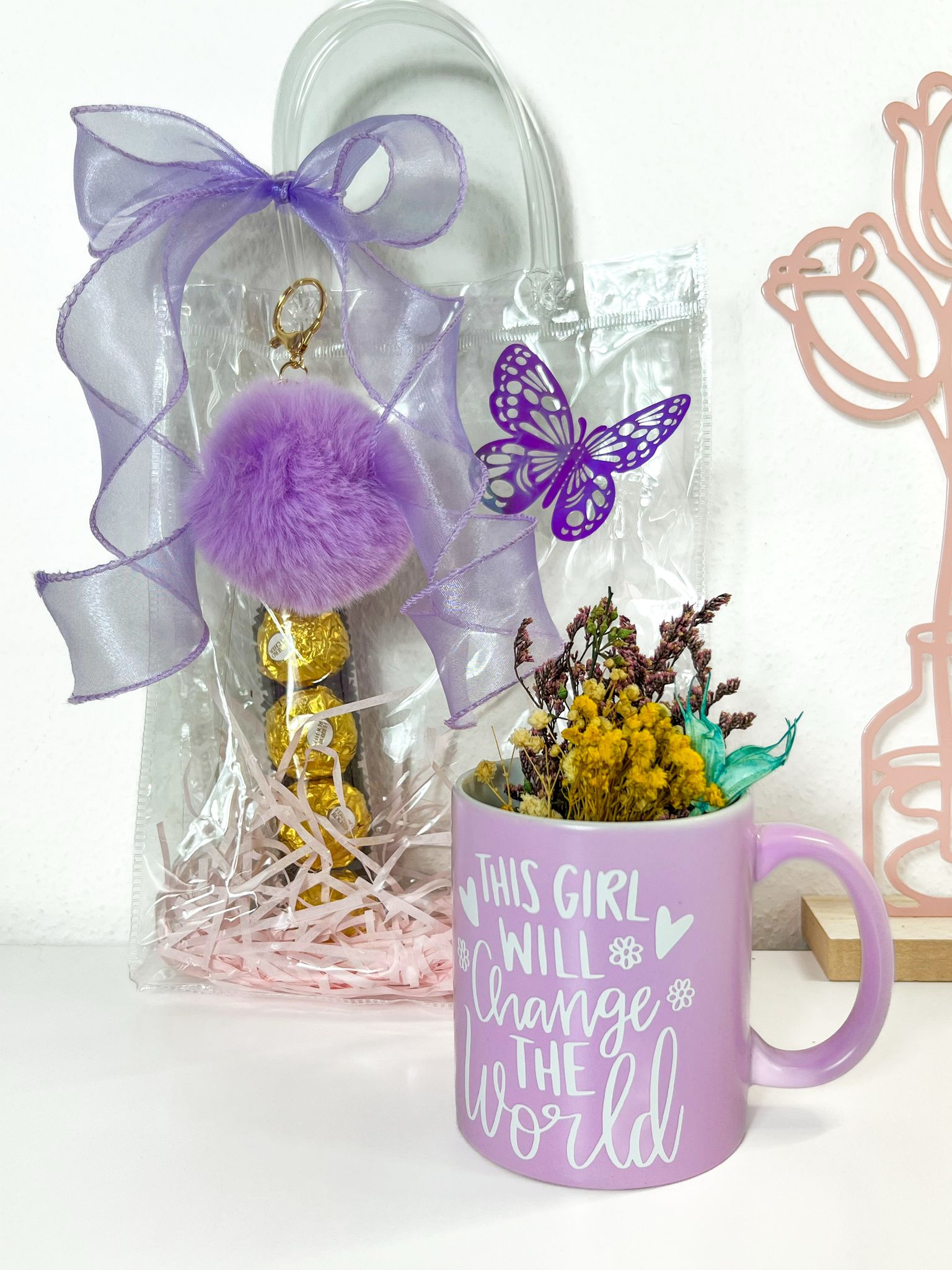Überraschen Sie diese besondere Frau mit einem Detail voller Inspiration und Süße. Dieses wunderschöne Geschenkset enthält eine lilafarbene Tasse mit dem Satz „This Girl will change the World“, einen flauschigen Schlüsselanhänger, köstliche Schokolade und eine florale Note, die ihre Schönheit und Stärke symbolisiert.